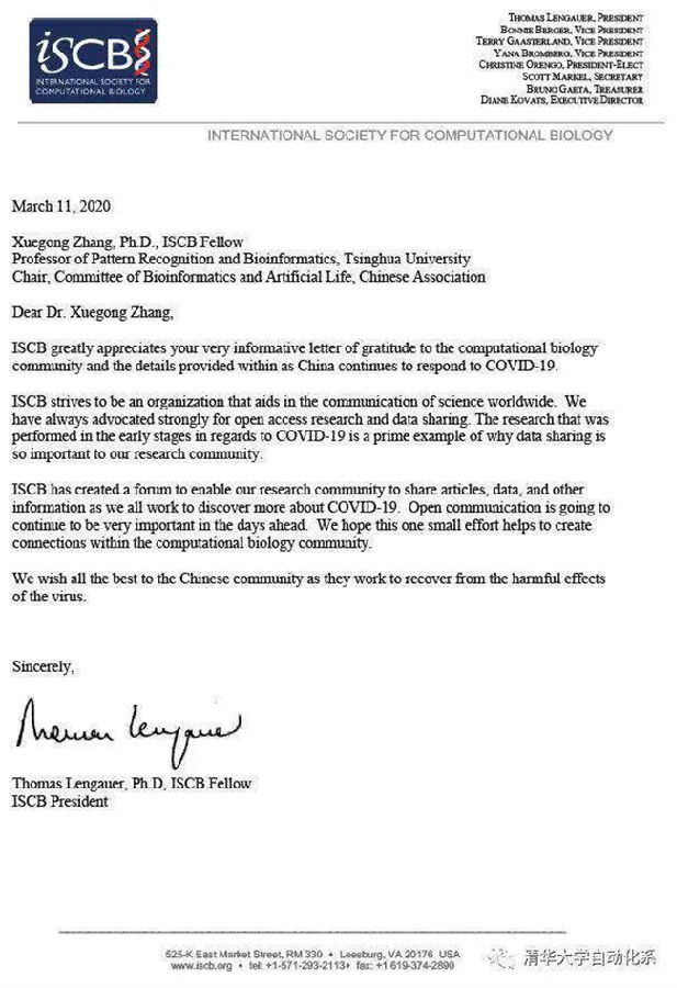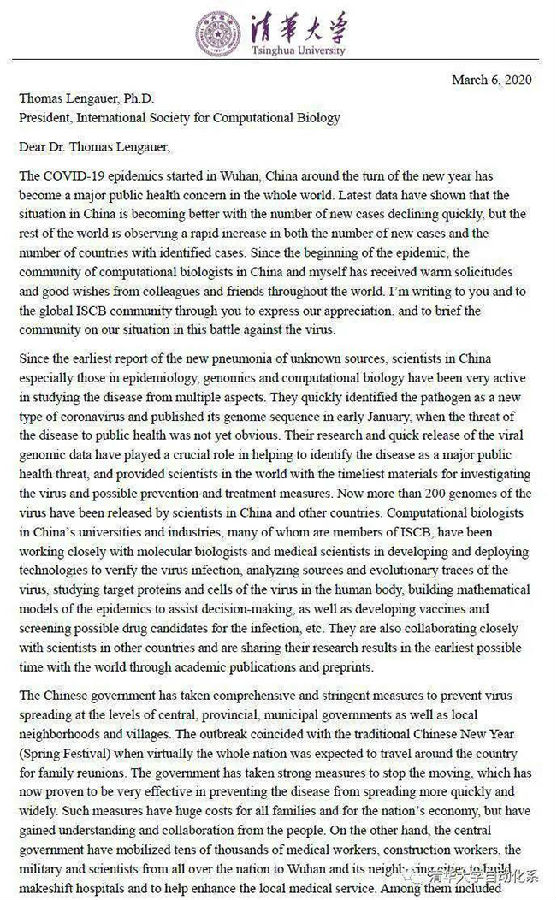 In early March, Professor Zhang Xuegong from the Department of Automation at Tsinghua University wrote a letter to the International Society for Computational Biology (ISCB), in which Professor Zhang illustrated the work that Chinese computational biologists have made in the battle against the COVID-19, and expressed his gratefulness for the support from international counterparts.