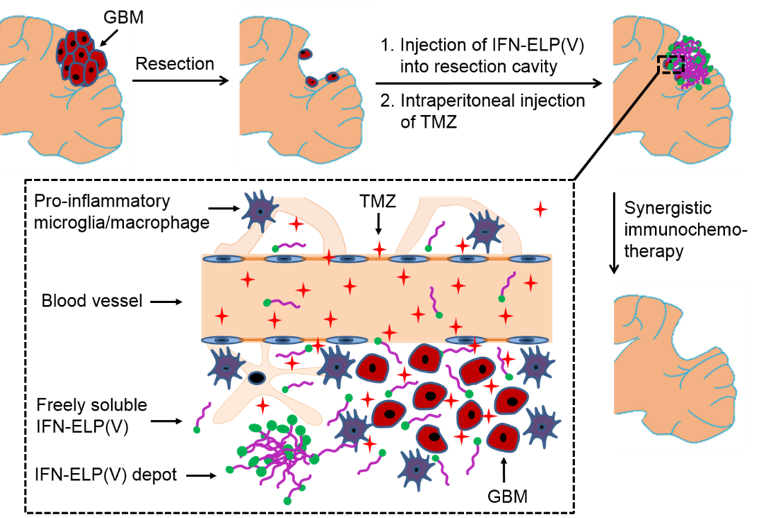 这一最新治疗研究成果近日发表在国际材料学期刊《生物材料》(Biomaterials),题目为“温敏性干扰素-多肽融合蛋白联合替莫唑胺在胶质母细胞瘤术后免疫化疗中的研究”(Spatiotemporal combination of thermosensitive polypeptide fused interferon and temozolomide for post-surgical glioblastoma immunochemotherapy),梁平、王贵怀为该论文第一作者,高卫平为通讯作者。
