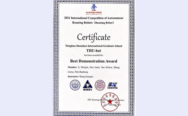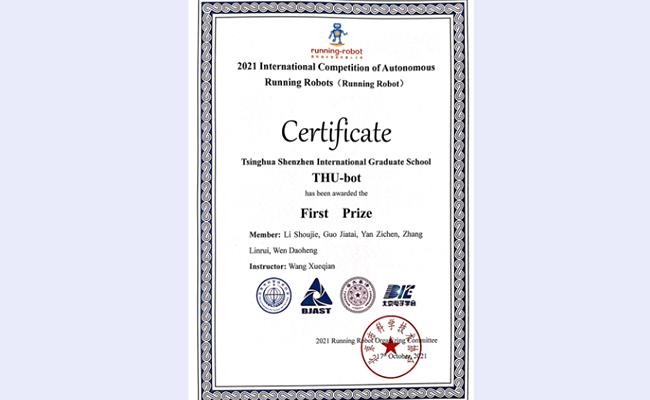 清华新闻网11月3日电 2021国际自主机器人大赛(2021 International Competition of Autonomous Running Intelligent Robots, RUNNING ROBOT)于10月15日-17日在北京科技中心举办。深圳国际研究生院信息科学与技术学部智能机器人实验室学生团队“THU-bot”(指导教师:王学谦教授)荣获大赛一等奖和最佳表演奖。团队成员包括人工智能项目2020级硕士生李寿杰、张麟睿、颜子琛和郭家泰,以及大数据工程项目2020级硕士生闻道恒。