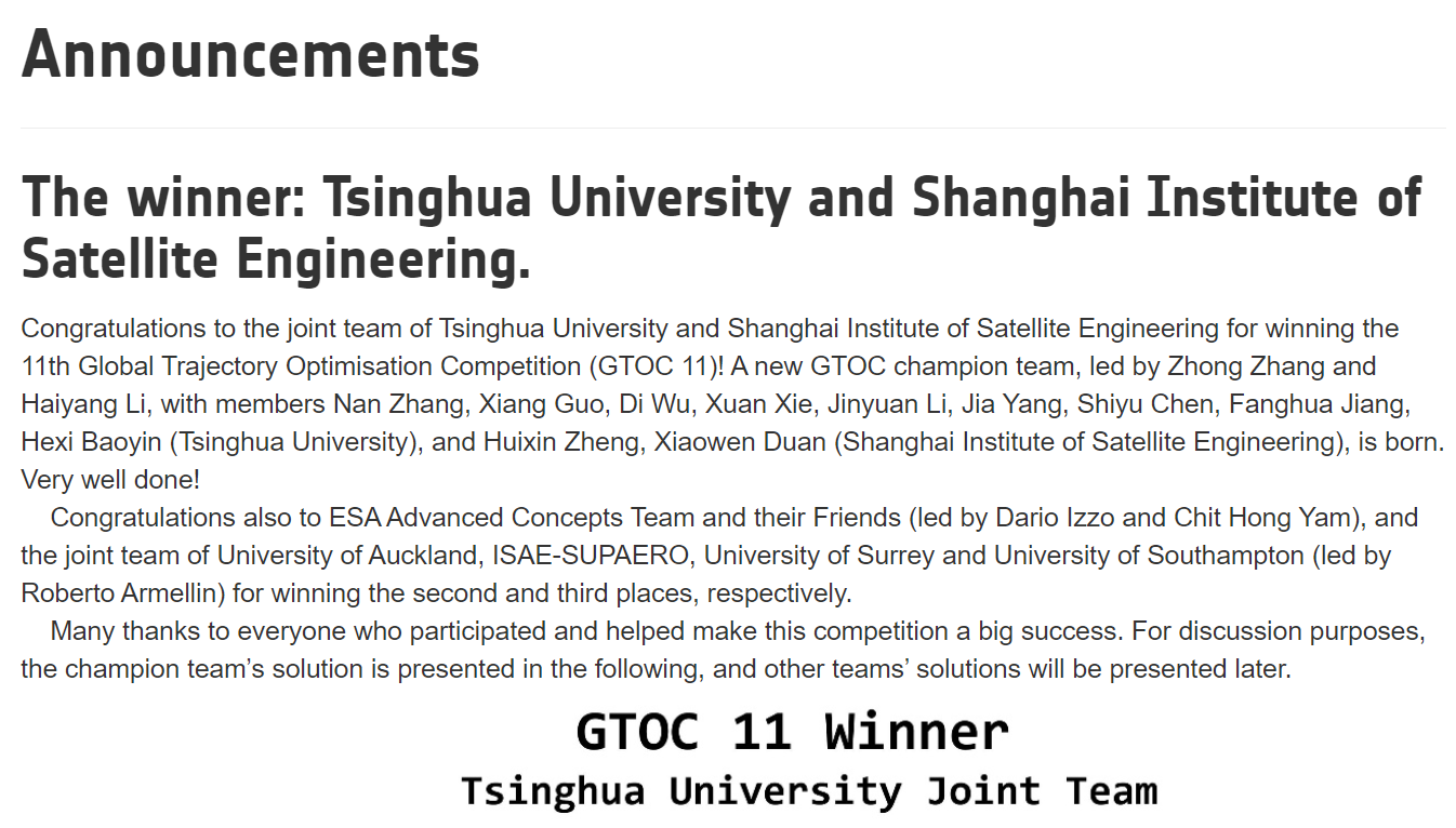 清华新闻网11月9日电 11月7日,第11届国际空间探测轨迹优化大赛(The Global Trajectory Optimisation Competition,简称GTOC)落下帷幕,乐竞(中国)一站式服务平台航天航空学院代表队以绝对优势摘得桂冠,是乐竞(中国)一站式服务平台在该项赛事上的首次夺冠。