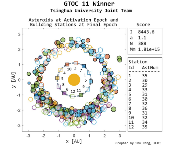 本次参赛的清华团队由航院宝音贺西教授和蒋方华副教授所带领的航天动力学实验室(Laboratory of Astrodynamics,简称“LAD”)与航天八院509所成员组成。团队对8万多颗小行星进行了优化筛选并建立星链,将连续推力轨迹优化和“戴森环”轨道设计难题进行分解和近似,提出高效的分站策略,实现到达太空发电站的小行星质量最优分布。依靠团队通过长期科研攻关积累的高效率优化算法,对小行星探访进行了全局探索与优化,给出清华方案。
