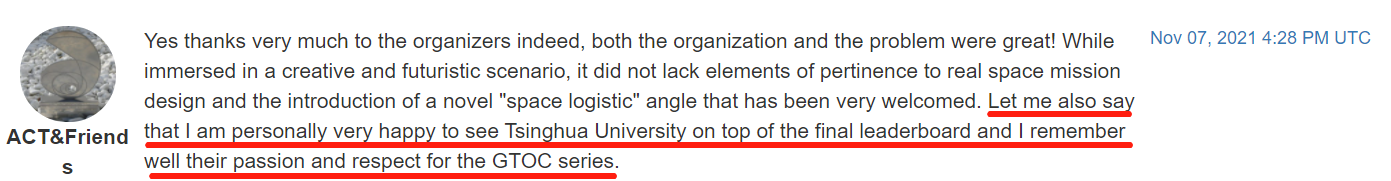 凭借过硬的专业能力和顽强的拼搏精神,在竞赛过程中清华团队一路领先,并在最后一周提出了更具创意的建造方案,绝对优势保持到最后,亚军的欧空局在第一时间表示了祝贺。本次竞赛第2-6名均为欧美强队,往届夺冠队伍有美国航空航天局(NASA)、欧空局等世界知名航天研究机构。清华团队的夺冠向全球展示了航天任务设计领域的中国实力。