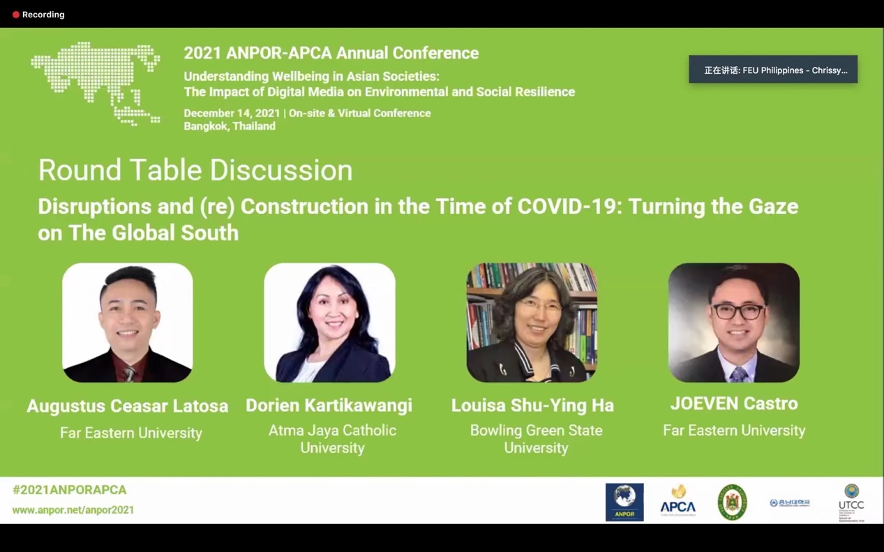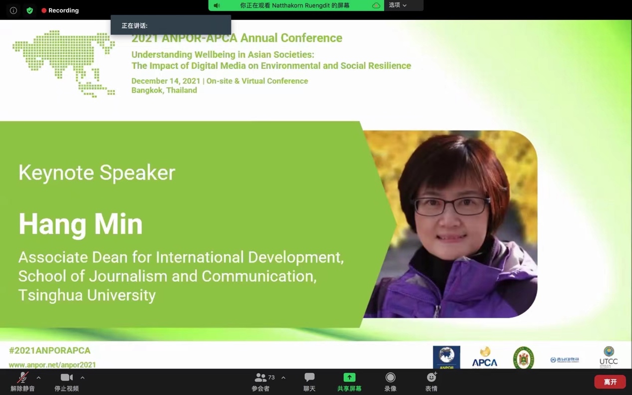 清华新闻网12月22日电 由亚太新闻传播学会联盟(APCA)与亚洲舆论学会(ANPOR)联合举办的2021年学术年会,于12月14日在泰国曼谷以线下线上相结合的方式举行,年会的主题是“了解亚洲社会的福祉:数字媒体对环境和社会复原力的影响”(Understanding Wellbeing in Asian Societies: The Impact of Digital Media on Environmental and Social Resilience)。年会发表了来自十多个国家和地区的学者的96篇学术成果,按照数量多少依次来自中国大陆,泰国,印度尼西亚,马来西亚,韩国,中国香港、美国,日本,巴基斯坦,中国澳门,柬埔寨等国家和地区。中国大陆有42篇论文入选。