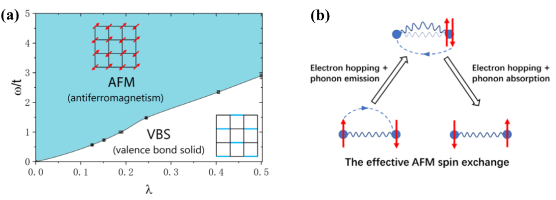 清华新闻网1月6日电 在强关联量子体系中,反铁磁性(antiferromagnetism)通常被认为与电子间的强库仑排斥作用紧密相关,比如哈伯德模型描述的莫特绝缘体中的反铁磁序;但电子和声子的耦合在量子材料中普遍存在并能调制电子间有效的相互作用,比如电声耦合产生的电子间的有效吸引相互作用是超导电性或电荷密度波的一个重要微观机制。然而,迄今为止尚没有研究表明反铁磁序可以由电子和声子的耦合直接产生。近年来,越来越多的实验和理论研究表明电声子耦合对理解强关联材料中的高温超导等物理现象也十分重要,而后者常常与相关的量子材料在未掺杂时的反铁磁序有关,因此,探寻反铁磁序与电声子耦合的内在联系具有重要的意义。
