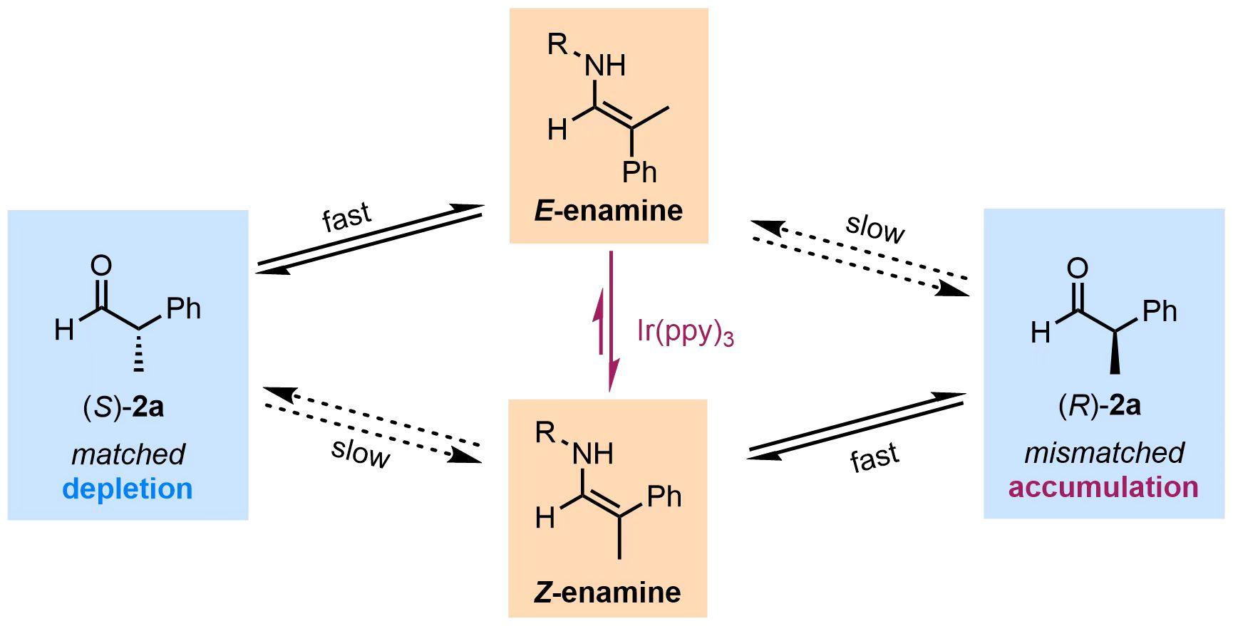 该团队通过系统深入的实验分析和理论计算,厘清了去消旋化的机理,提出了去消旋化手性合成的全新路径(图2):在S-构型手性伯胺催化下,S-醛优先与催化剂形成E-烯胺,随后被光异构化生成Z-烯胺,后者快速水解质子化生成R-醛。构型匹配的S-醛不断被消耗,不匹配的R-醛不断富集,从而实现了去消旋化。在此过程中,光异构化提供了去消旋化反应的驱动力,适当的苯甲酸添加剂调节了达到平衡的速率,伯胺催化剂的立体专一性保证了产物的高对映选择性。