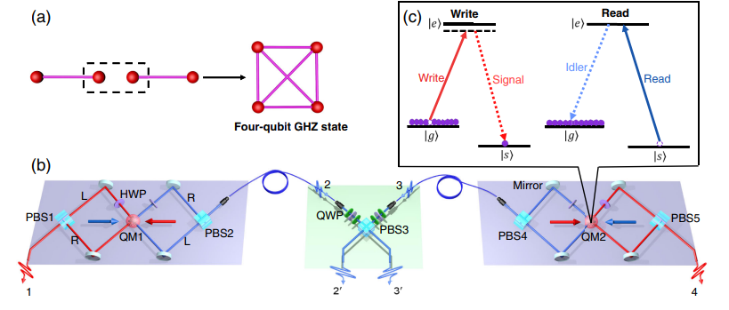 在此项工作中,研究人员通过将超低温的铷原子气体囚禁在光晶格中,并利用原子基态能级当中一对钟态能级跃迁,成功将冷原子量子存储器的相干时间提升至数十毫秒量级。研究人员先利用第一个量子存储器(QM1)产生一对光子和原子之间的纠缠态并将量子态存储下来,然后再利用第二个量子存储器(QM2)产生第二对光子和原子之间的纠缠态,最后同时读取两个量子存储器内部的量子态并将他们投影到目标的四光子GHZ态上。研究结果表明,通过这种方式产生的四光子GHZ态,其制备效率线性正比于单个EPR(Einstein-Podolsky-Rosen)纠缠对制备效率,与没有使用量子存储方案所导致的制备效率正比于单个EPR纠缠对制备效率二次方关系相比,改变了制备效率在规模化上的复杂度。当未来需要连接N对纠缠对时,其制备效率将从指数衰减量级上升到多项式级别,展示了量子存储方案在制备大规模图态的优越性。此外,研究人员还进一步利用制备的四光子GHZ态验证了MABK不等式,并演示了量子密码学当中的量子秘钥分发协议。此项工作实现了一个高效制备大规模图态的原型,从而为其在量子信息科学和量子计量中的各种应用迈出了重要的一步。