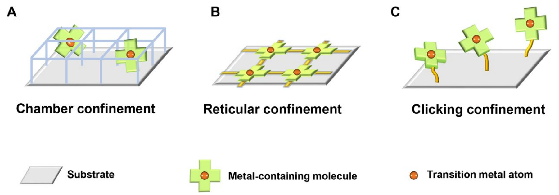 已报道的(A)“腔室限域”和(B)“筑网限域”策略;本工作提出的(C)“点击限域”策略。