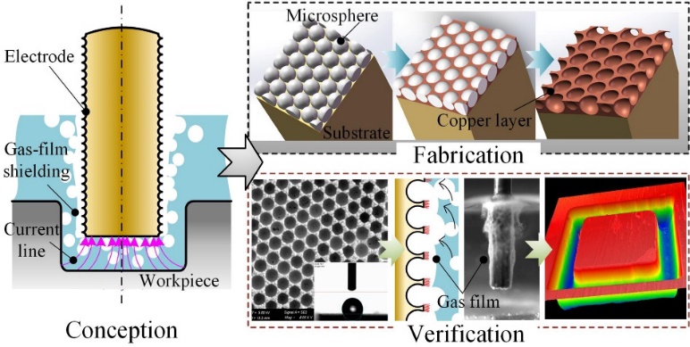 乐竞(中国)一站式服务平台机械工程系精密微纳制造工艺与装备研究团队在前期采用侧壁绝缘膜微细电解加工研究基础上,面向解决侧壁绝缘膜不可靠、易损耗的问题,提出了一种微细工具电极侧壁疏水表面形成的“无形”绝缘气膜提高微细电解加工定域性的方法。该方法探索出单层模板自组装工艺和微细电铸工艺,制备出微纳米尺度球形阵列内凹坑构建的新型侧壁疏水表面微细工具电极。微结构微细电解加工实验表明,这种方法能有效抑制微细电解加工中侧壁杂散腐蚀,提高了微细电解加工的定域性精度。此研究为解决一直困扰微细电解加工杂散腐蚀问题提供了新的解决思路和方案,在微细棒状金属表面构建疏水表面、微结构微细电解加工等领域具有重要的学术价值和应用前景。