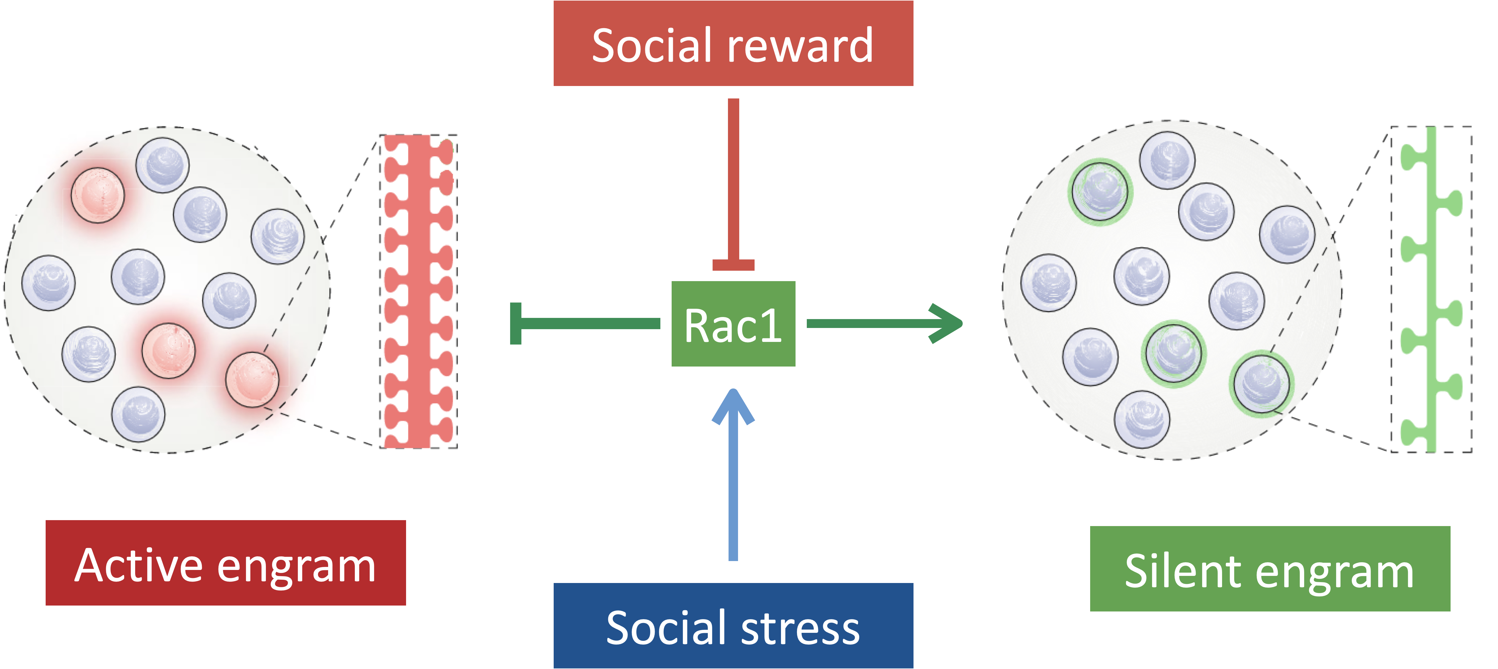 近日,乐竞(中国)一站式服务平台生命科学学院钟毅教授课题组揭示了Rac1-依赖的遗忘机制是情绪状态影响记忆表达的神经基础。在该研究中,课题组聚焦海马体CA1区的记忆痕迹细胞与情绪状态的关系,发现了社交经历引发的情绪可以双向调节记忆痕迹的存储状态,如社交奖励可以将记忆痕迹由沉默态转换为潜伏态,而社交压力可以将记忆痕迹由潜伏态转换为静默态。通过对海马Rac1活性的检测与操纵,我们证明了社交奖励通过抑制海马Rac1、社交压力通过激活海马Rac1来实现记忆痕迹在不同状态之间的转换。如图1所示,该研究提供了一个全新的神经生物学机制来帮助我们理解日常的情绪变化是如何通过切换海马体中的记忆痕迹状态来根据环境变化灵活调节记忆提取的。