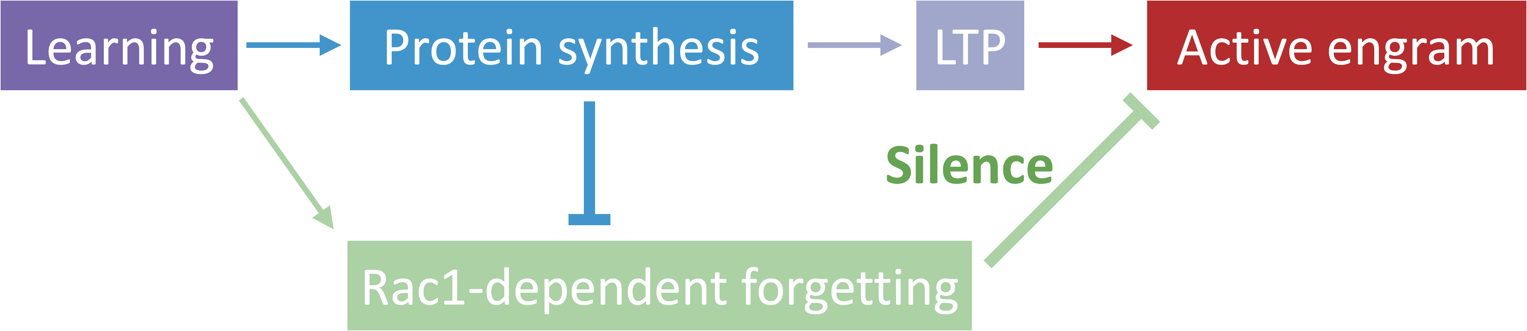 该研究也暗示了在经典的长期记忆形成过程中蛋白质合成所介导的固化过程和Rac1活性介导的主动遗忘过程是一个统一交互的过程。如图2所示,学习会同时引发蛋白质合成介导的记忆固化过程以实现形成激活态的记忆痕迹细胞,同时学习还会激活Rac1依赖的主动遗忘过程来驱使记忆转换为静默态。通常的有效学习中,蛋白质合成介导的固化过程同时会产生对记忆遗忘的抑制,来保证记忆的提取并使记忆可以稳定维持。而这种动态的记忆与遗忘的平衡过程最终赋予了动物可以根据实际面对的场景来灵活地双向调节记忆的提取效率的能力,从而更好地面对复杂多变的环境。本研究对遗忘机制是如何参与到记忆调控中提出了新的理解,即遗忘是调节记忆痕迹状态的主动过程,可能是记忆灵活性与动态性的神经基础。