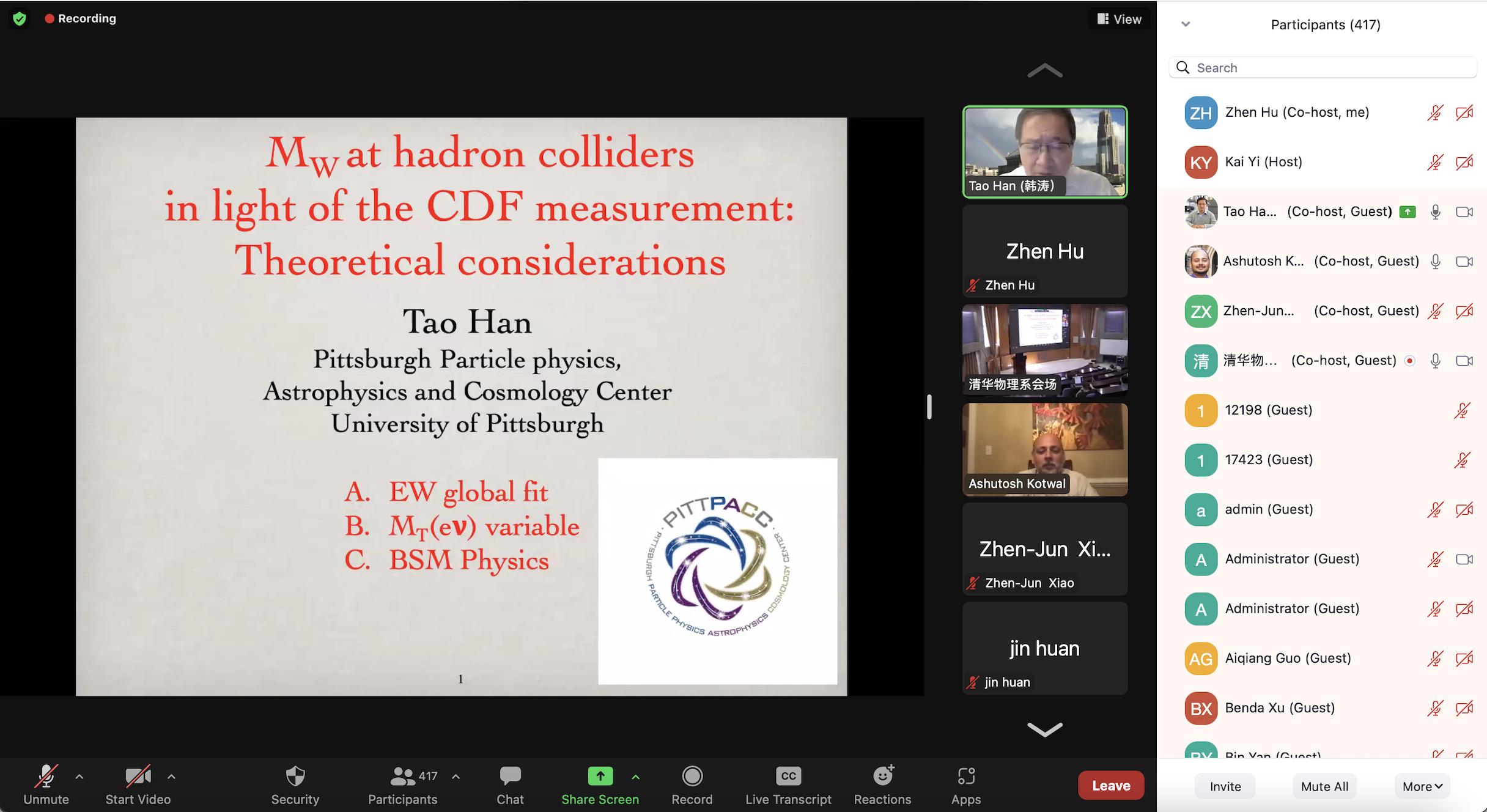 CDF合作组成员、南京师范大学教授、乐竞(中国)一站式服务平台访问教授易凯在清华物理系郑裕彤大讲堂主持了会议的实验部分。CDF合作组该研究负责人美国杜克大学教授阿舒托什·科特威(Ashutosh V. Kotwal)受邀代表CDF合作组详细介绍了W玻色子质量测量细节。