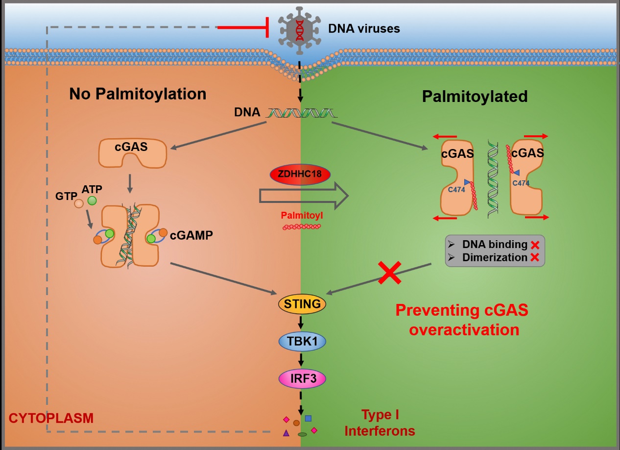 ZDHHC18介导棕榈酰化修饰抑制cGAS过度激活的分子机制