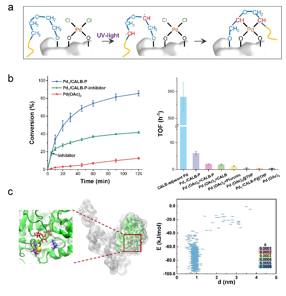 图.(a)酶-金属单原子复合纳米催化剂的制备方法;(b)脂肪酶-钯单原子复合催化剂在烷基-烷基交叉偶联中的催化效率;(c)复合催化剂与底物结合的分子动力学模拟计算