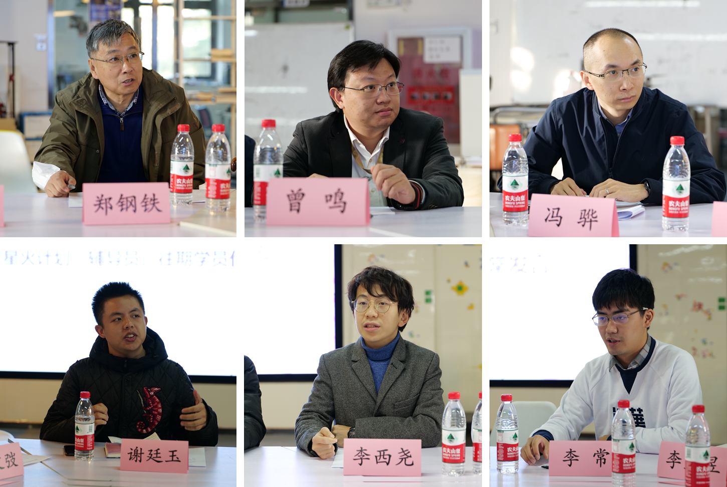 师生代表郑钢铁、曾鸣、冯骅、谢廷玉、李西尧、李常分别发言(从左至右、从上至下)