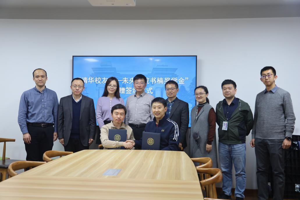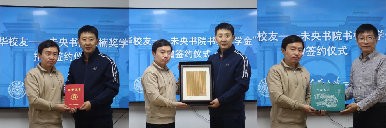 孙大鹏代表基金会向徐书楠表达了感谢,双方签署了捐赠协议。随后,孙大鹏代表清华教育基金会向徐书楠颁发证书并赠送纪念品,梁曦东向徐书楠赠送了书院纪念品。