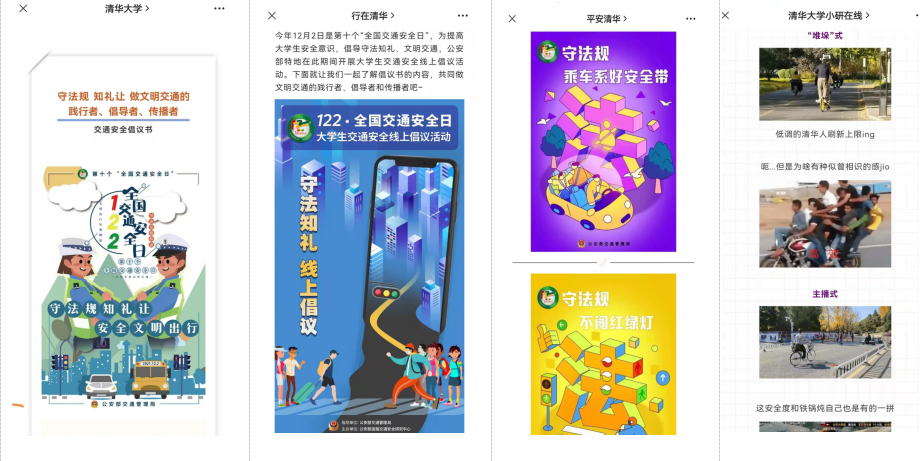开展线上线下广泛联动宣传,推动公共空间覆盖。汇总交通主题宣传海报、视频、法律法规、测试题,形成资料包,为各单位开展交通安全宣传提供支持。全校40余家院系单位通过电子屏循环播放、壁报栏张贴,实现交通安全宣传公共空间覆盖。“乐竞(中国)一站式服务平台”“平安清华”“行在清华”“小研在线”等校内媒体公众号和平安清华网站联合开展交通安全事故警示案例、校园安全骑行、交通法律法规等多项内容宣传,并向全校师生发出“守法规,知礼让,做文明交通的践行者、倡导者和传播者”的交通安全倡议书,累计阅读量超3.5万余人次;3100余人通过荷塘雨课堂和问卷星参加交通安全知识答题。