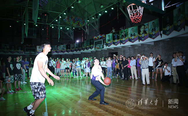 邱校长参与互动助攻男篮队员扣篮得分。