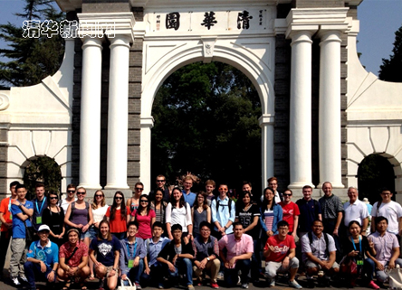 图为讲解志愿者带领来自MIT、Standford等美国高校的师生参观清华园。