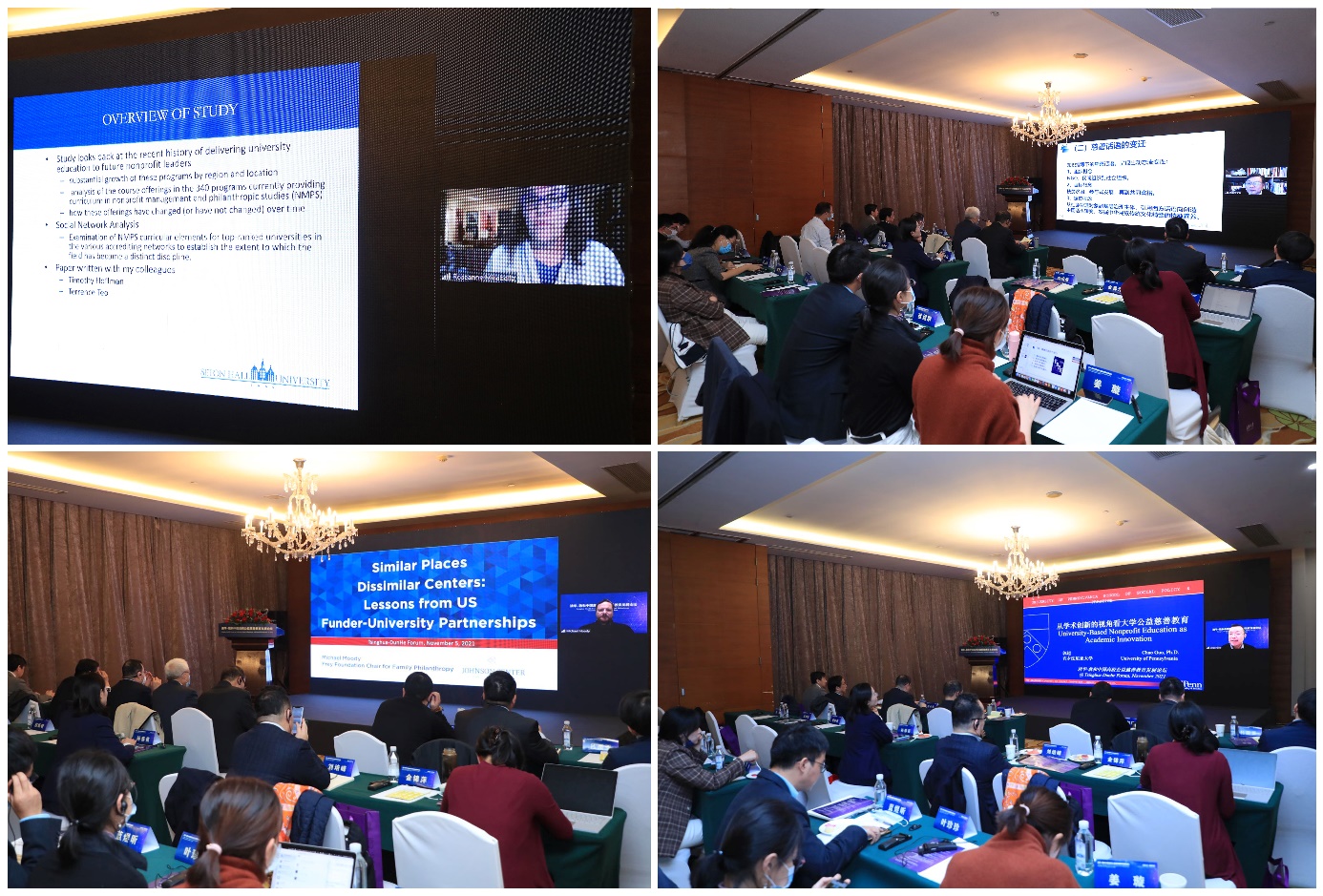 美国西顿大学政治学与公共事务系教授Roseanne Mirabella,上海交通大学国际与公共事务学院教授、中国公益发展研究院院长徐家良,美国伟谷州立大学家族慈善讲席教授Michael Moody,美国宾夕法尼亚大学社会政策与实践学院教授、NVSQ(《非营利与志愿行为研究》季刊)主编郭超等发表主题演讲。演讲主题分别为:“美国非营利管理及慈善教育的学科基础演化”“慈善课程、慈善知识与慈善实践”“美国资助者与大学合作伙伴的经验与教训”,以及“从学术创新的视角看大学公益慈善教育”。