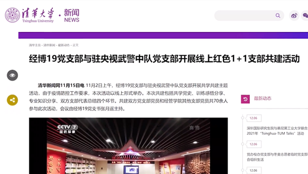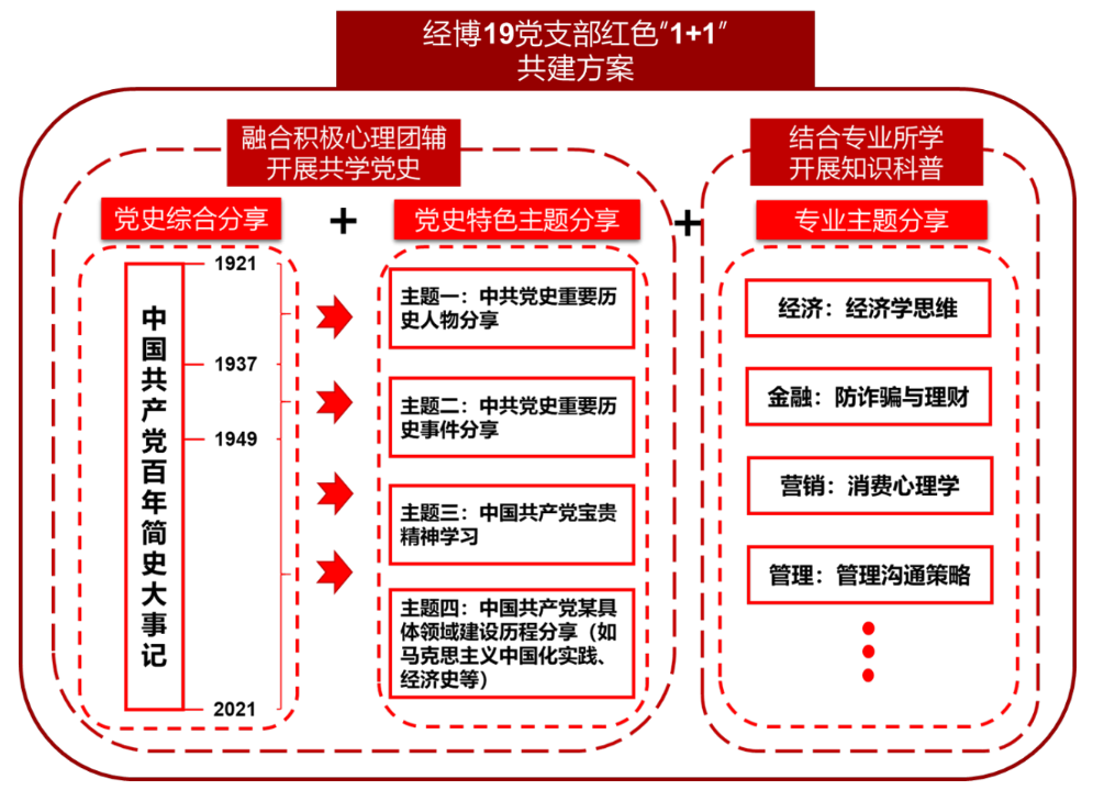 经博19党支部与驻央视武警中队、建外街道开展党史共学活动,从党史中提炼出超越、勇气、智慧等积极心理要素,构建以党史学习为主、专业科普为辅的宣讲体系,形成包括百年党史串讲、长征精神、抗日民族统一战线的形成、管理沟通、金融防诈骗与理财知识、生活中的经济学等7大主题课程。通过线下共学、线上交流、实地观摩、参访交流等形式,先后与驻央视武警中队党支部、建外街道党建中心开展7次内容丰富的共建活动,发挥了朋辈激励的作用,为平安北京、创新北京的建设做出了贡献。红色“1+1”活动得到中央电视台、乐竞(中国)一站式服务平台新闻网等媒体平台的宣传报道。