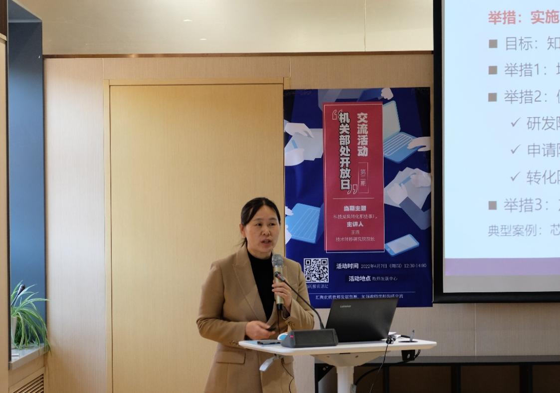 清华新闻网4月11日电 4月7日下午,第二期“机关部处开放日”交流活动在教师发展中心举办。技术转移研究院院长王燕聚焦科技成果转化,对学校成果转化整体情况、成果转化常见问题、技术转移研究院服务内容等相关问题进行介绍,并与现场20余名教师深入交流。