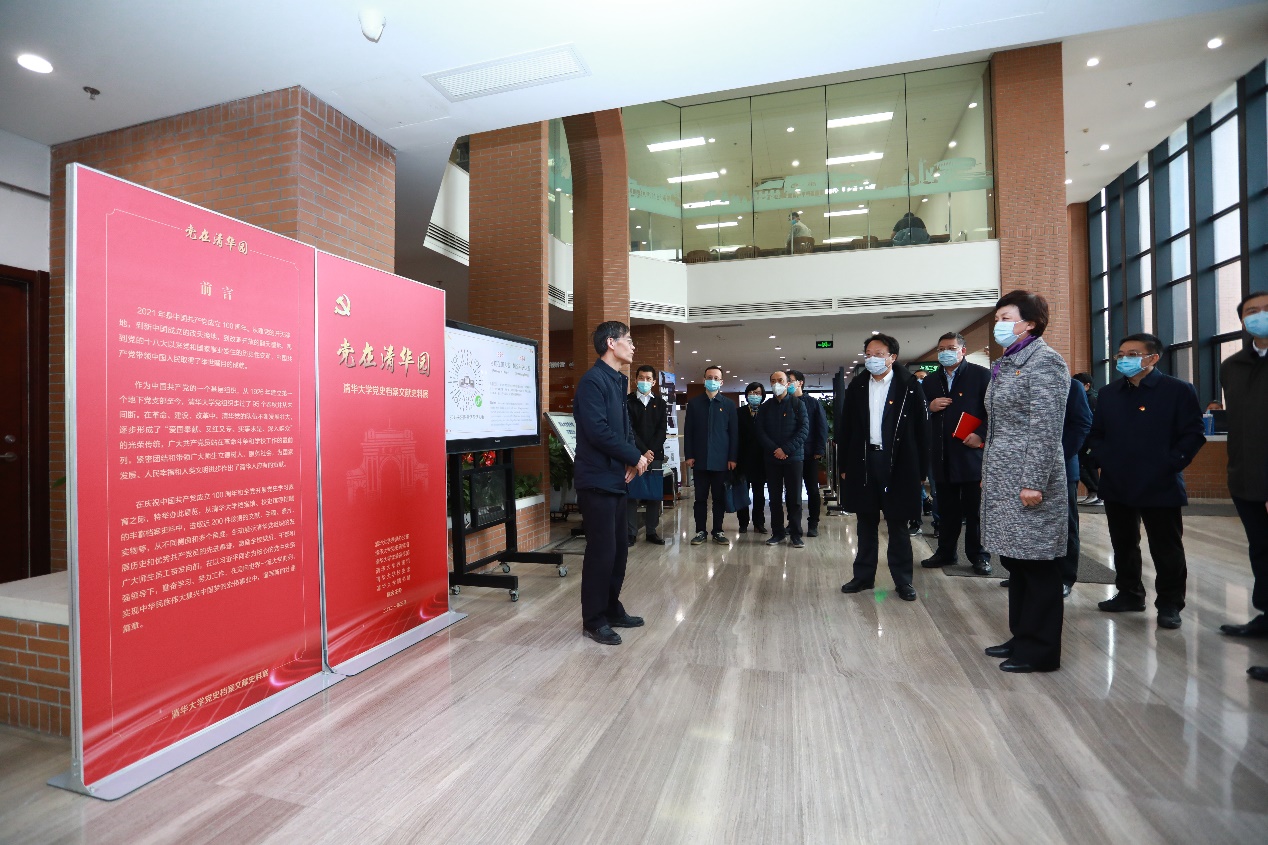 陈旭一行首先听取了党史研究室主任、档案馆馆长范宝龙的介绍,并在工作人员带领下仔细浏览一件件珍贵而生动的展品。展览选取档案馆、校史馆、图书馆等馆藏的近200件文献、手稿、图书、照片、实物等,展现清华党组织的发展历程和光荣传统。其中有,中共清华第一个支部诞生地三院历史图片、清华第一任党支部书记王达成访问记、1926年至1937年清华地下党历届支部书记名单和清华解放前各时期地下党员名单,学校历次党代会相关档案史料、历届党委书记校长给师生员工讲党课的资料,清华党组织获得的荣誉证书和奖杯,以及清华最早的共产党员施滉、上世纪50年代老知识分子中第一个入党的教授刘仙洲、隐姓埋名捐资助学的“炭火教授”赵家和等清华党史典型人物和优秀共产党员的实物史料等,内容丰富精彩。
