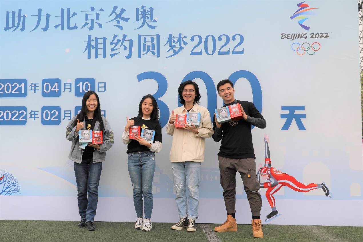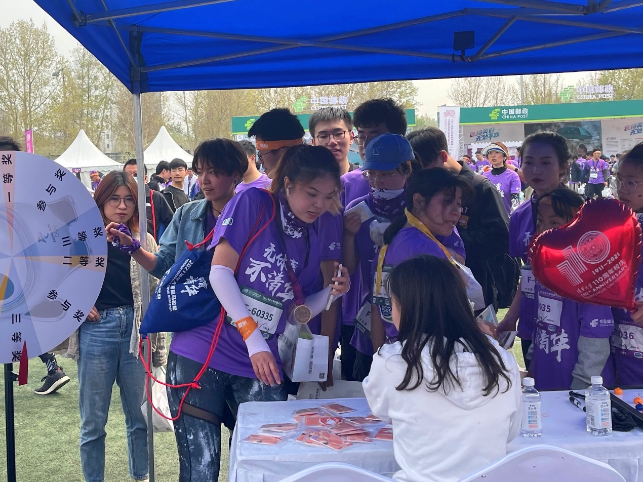 在校园马拉松现场还设置了丰富多彩的冬奥300天倒计时主题合影板、特色签到板和桌上冰壶体验等互动游戏。现场同学们在“冬奥倒计时300天”展板前签名拍照留念,并参与冬奥问答、桌上冰壶游戏、“玩转冰墩墩”转盘抽奖等活动了解冬奥竞赛项目。现场同学们热情高涨,在展台前排起了长龙。参与亲子跑的老师和校友,也带着小朋友们一同参与活动。现场气氛热烈,清华师生用热情参与诠释着对冬奥的热情和期盼。