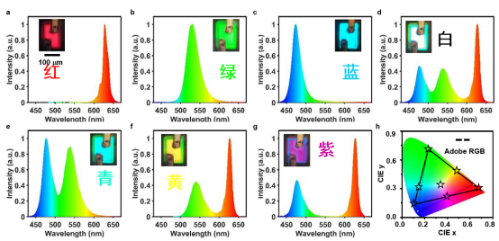 图3.堆叠RGB micro-LED器件的发光照片和电致发光性能