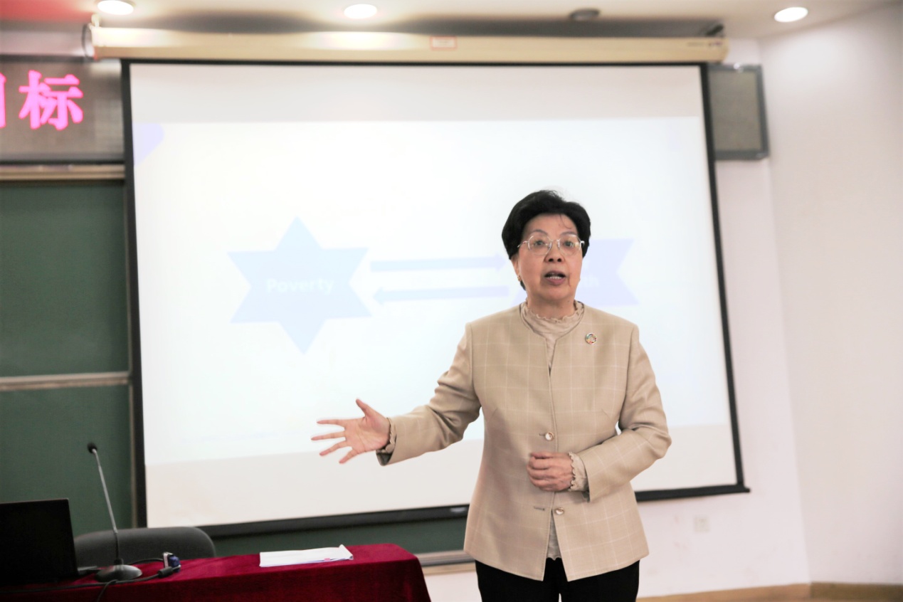 陈冯富珍从联合国千年发展目标及可持续发展目标谈起,重点讲解了“发展”的重要性,并以消除贫困与提升健康的关系为例,阐释了17个可持续发展目标之间密不可分、环环相扣的关系。陈冯富珍表示,经过多年的努力,我国已取得了脱贫攻坚战的全面胜利,这个胜利意义重大,不仅意味着我国提前十年实现了联合国2030年可持续发展议程减贫目标,更彰显了我国政府信守承诺、踏踏实实为人民谋福利的决心和行动力。 她以此为例,向同学们讲述“行胜于言”的重要性。她强调,国家或者个人要在世界上立足,就要用实实在在的行动来证明自己。谈及最近的新冠疫情,陈冯富珍表示,在应对疫情时应加强国际合作和多边合作,坚决杜绝单边主义,才能最终实现“全民健康覆盖”(Universal Health Coverage)。
