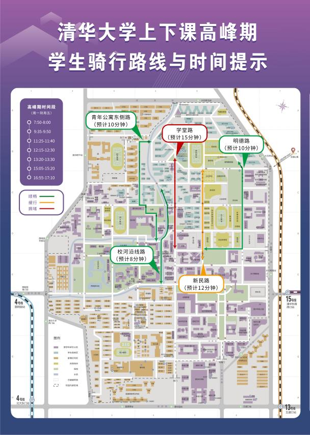 为了让同学们节省上下课高峰时段骑行时间,确保安全快速抵达目的地,保卫处还为同学们绘制了《清华学生上下课高峰期骑行地图》,提供了不同的切换路线,并标注了通行时间。