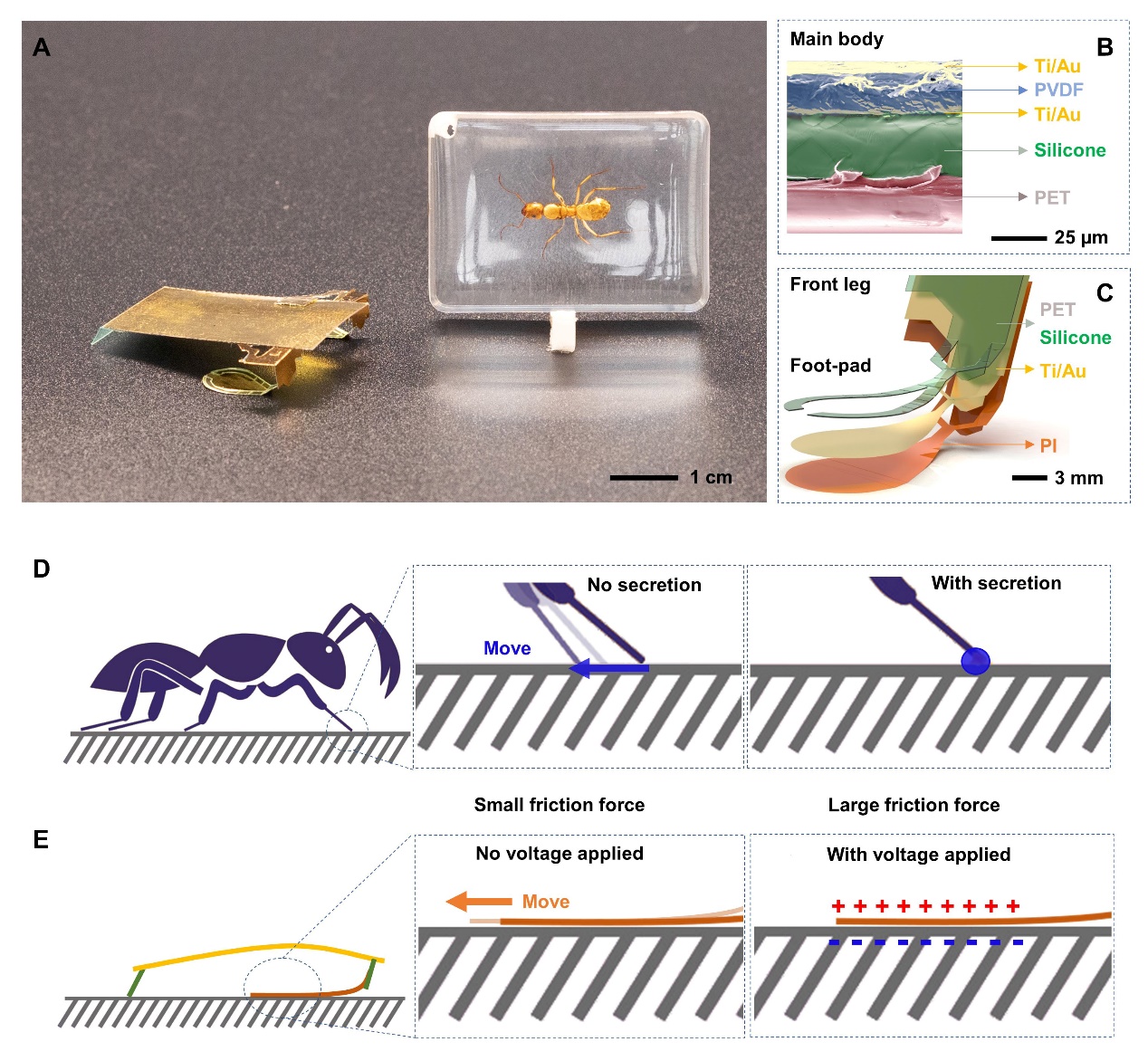 图A:柔性微型机器人基本结构;图B:静电足垫结构;图C:摩擦力控制原理。