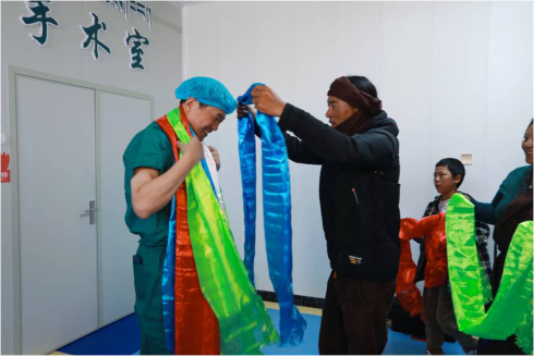 甘德县是包虫病防治的前线,7月9日,董家鸿赶到了甘德县人民医院。因为包虫病,藏族同胞措白已经接受过四次手术了,今年不幸再度复发。听说“北京大专家”来了,措白和家人早早地来到医院。“北京的大专家来义诊手术,想都不敢想。”措白说,“医生大老远地过来,但自己又没有啥能给的,心里觉得愧疚。”作为在海拔4200米甘德县的第一场包虫病手术,董家鸿带领团队成功为措白切除右肝与肝脏中叶的病灶。手术室门一开,等在手术室门外的家属们激动地把董家鸿围了起来,并献上了五颜六色的神圣哈达。