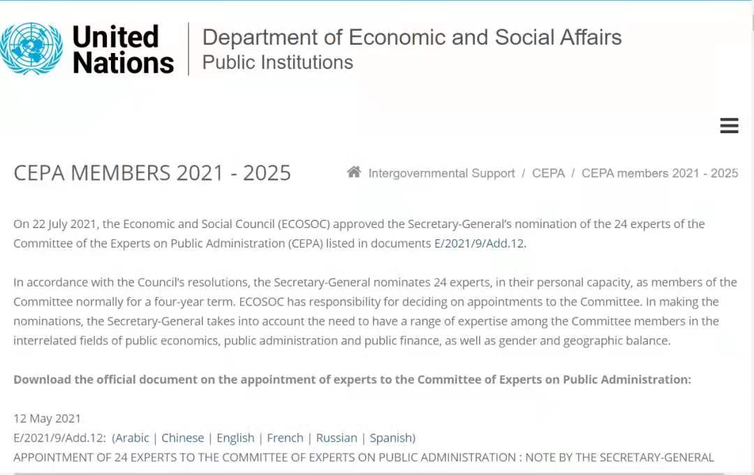 联合国经济及社会理事会正式通过联合国秘书长对24位公共行政专家委员会的专家提名