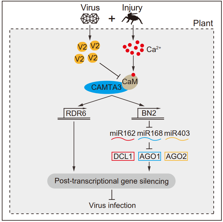 大多数植物病毒通过昆虫、线虫、真菌等传播,还有一些病毒通过物理接触传播,因而病毒侵染植物通常会伴随昆虫叮咬或者机械损伤。刘玉乐课题组发现:病毒侵染通常会伴随昆虫叮咬或者机械损伤,损伤会激活非常强烈的钙流,螯合了钙离子的钙调蛋白(CaM)会进一步结合并激活钙调蛋白结合转录因子CAMTA3。CAMTA3促进RNAi通路关键基因RDR6和BN2的转录,发现BN2能够作为核酸酶降解miR168、miR403、miR162等进而上调RNAi通路关键基因AGO1/2和DCL1的mRNA水平。这些RNAi核心基因的表达上调增强了植物抗病毒RNAi的能力,帮助植物更好地抵抗病毒侵染(图1)。该论文工作首次将钙信号与RNAi联系起来,揭示了一条全新的植物通过感知病毒入侵伴随的创伤导致的钙流增强植物抗病毒RNAi的通路(Wounding→Ca2+→CaMs→CAMTA3→BN2/RDR6→RNAi)。此外,刘玉乐课题组还发现:木尔坦棉花曲叶病毒和中国番茄黄化曲叶病毒的V2蛋白能够通过与CaMs互作干扰CaM3与CAMTA3的结合,抑制CAMTA3对RDR6、BN2等基因的转录调控,负调控植物抗病毒RNAi,从而促进病毒的侵染(图1)。这一发现揭示了一条全新的病毒反防御机制。这一工作再次证明了植物病毒与共同进化过程中,双方都可以衍生出自己的“武器”,为植物抗病毒与病毒反防御机制提供了新的范例。
