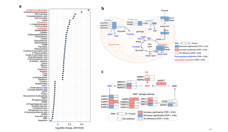 综上,该研究通过对ZIKV感染所致小头症的多组学分析,揭示了ZIKV感染导致显著的NAD+代谢重编程,并证明干预NAD+代谢能够从分子和整体层面上显著改善ZIKV感染所致的小头症。该研究不仅提供了ZIKV感染后不同分子层面重塑的组学大数据信息,也为理解ZIKV感染所致小头症的分子机制提供了新见解,并提示干预NAD+代谢或可作为治疗ZIKV感染所致小头症的潜在新策略。