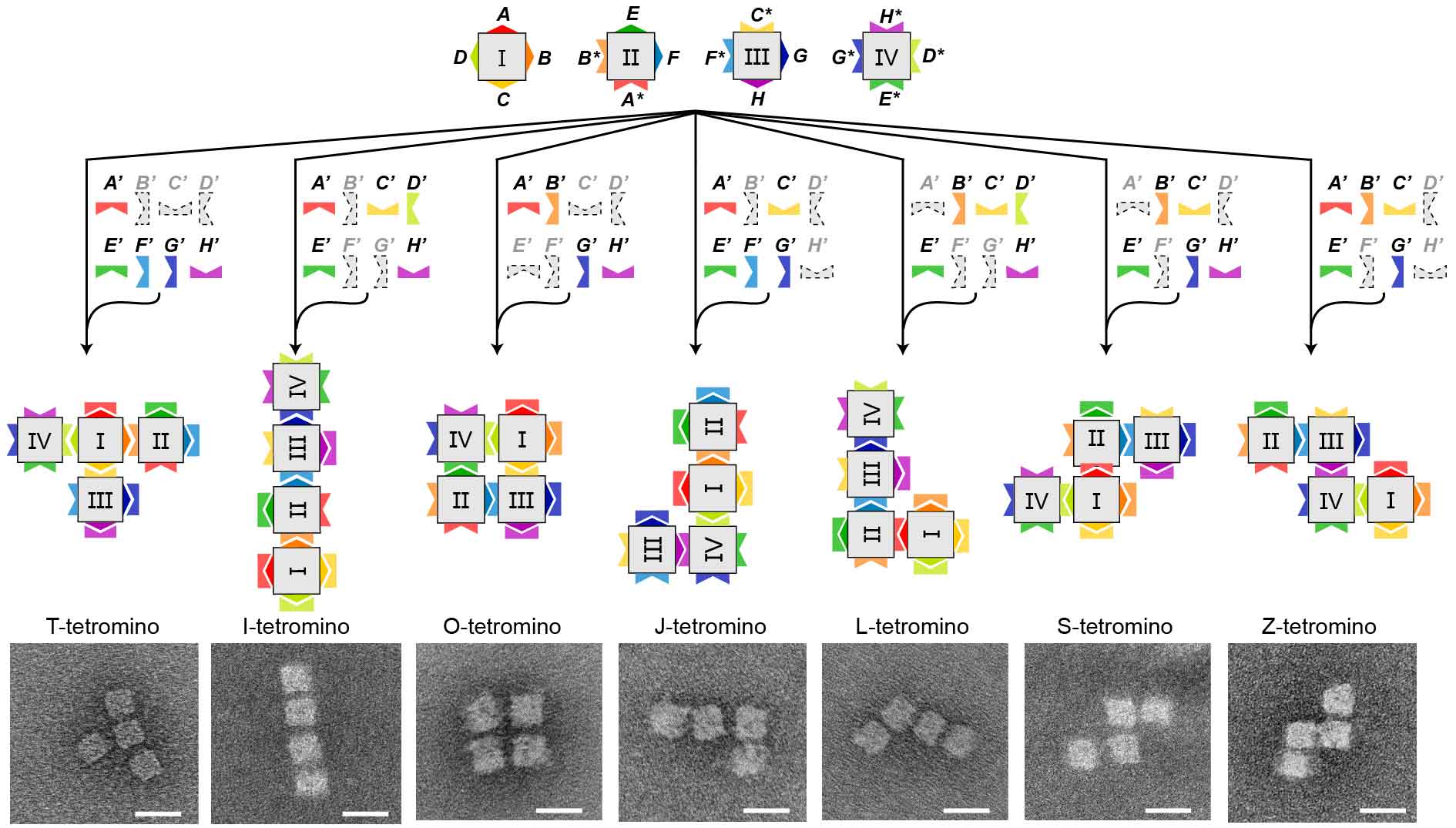图1基于非黏性末端链置换方法的三维DNA长方体纳米结构单元形成不同的四聚体复合体的操作和结果。四种三维长方体DNA纳米结构单元的四个侧面分别相互配对(相互匹配的颜色的凹凸面代表可以配对的侧面和可配对的封闭链)。当特定的封闭链集合(用彩色表示使用的封闭链,用灰色表示未采用的封闭链)加入到相同的四种单元混合体系中,能够控制形成七种俄罗斯方块中的一种。最下排为电子显微镜成像结果,比例尺:25纳米。
