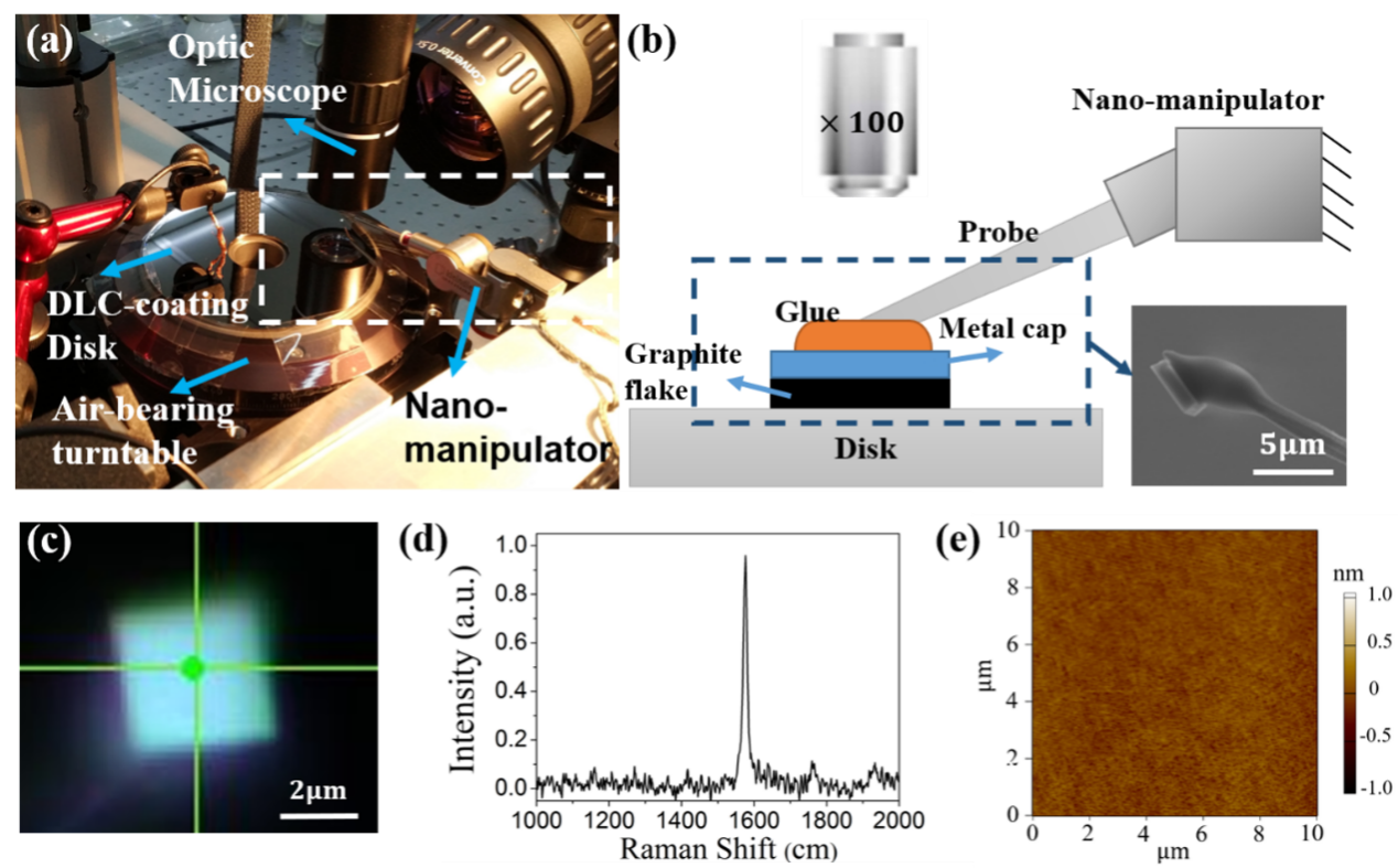 在本研究中,研究者将微米尺度石墨片粘接在了探针前端,通过纳米操作手操作石墨片与一块盘片上的原子级光滑的类金刚石薄膜接触。石墨片位置固定,盘片的转动使得石墨片与类金刚石薄膜间发生相对滑动。光学显微镜可以实时观测石墨片在盘片上的滑动状况。