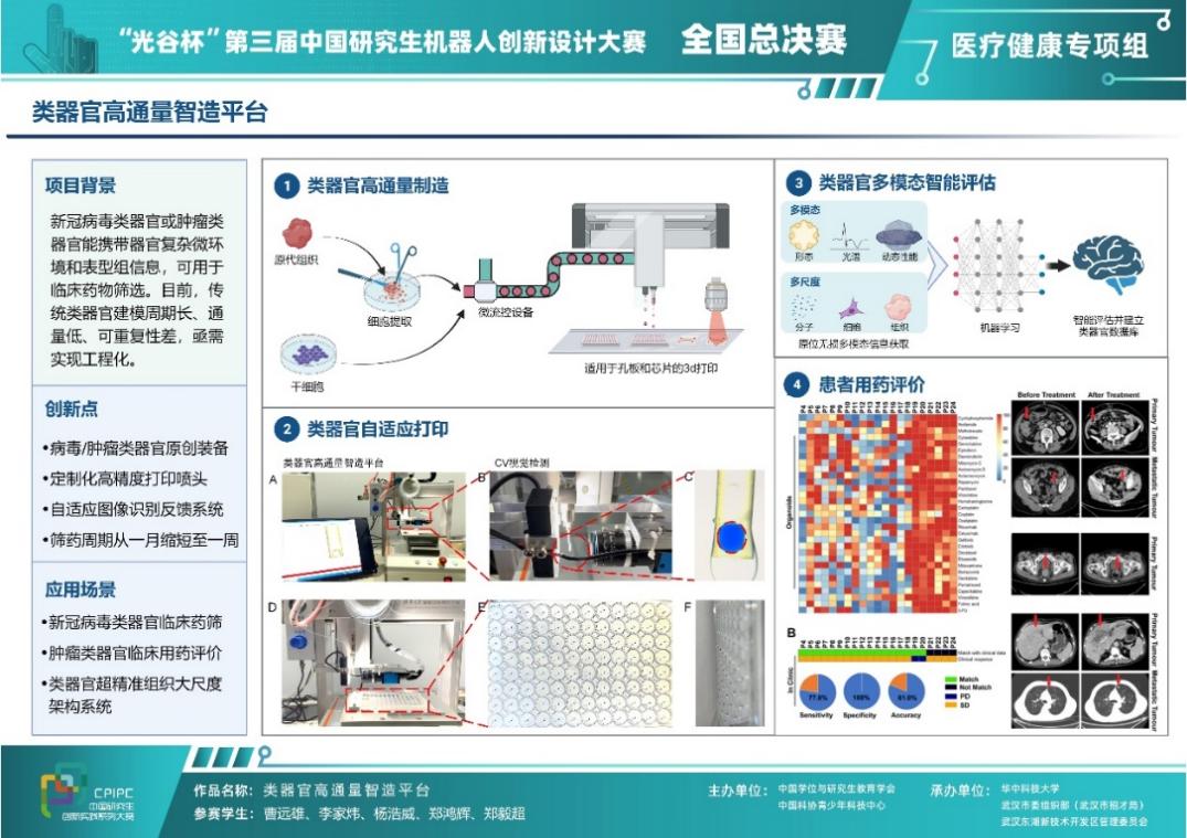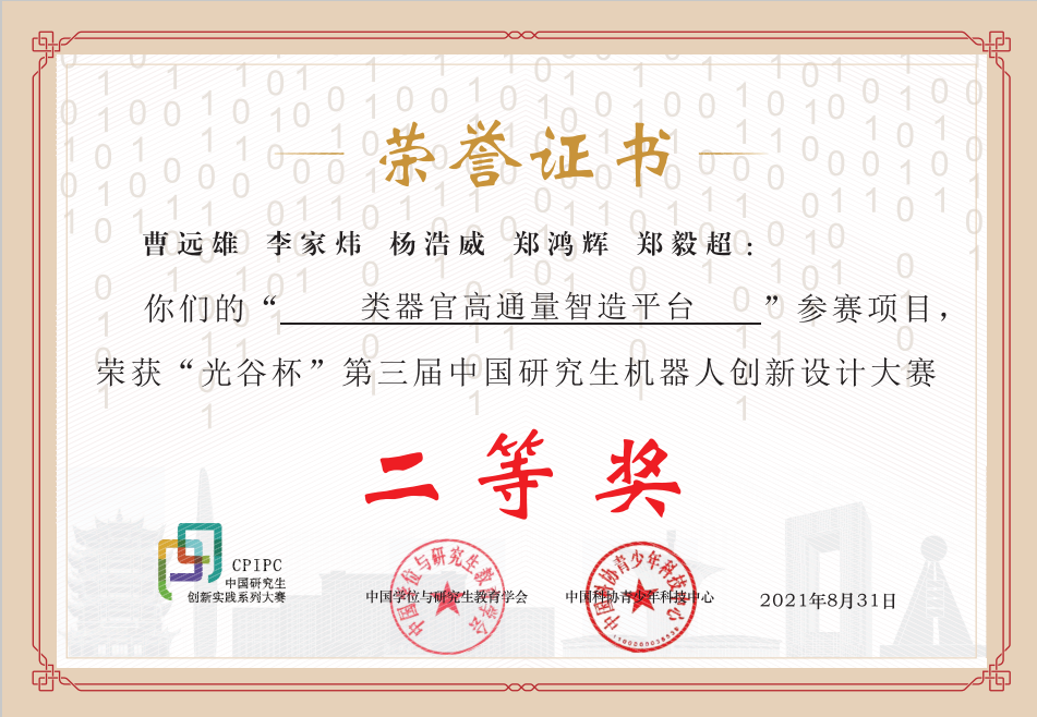 清华新闻网9月15日电 近日,“光谷杯”第三届中国研究生机器人创新设计大赛总决赛举办,来自全国73家培养单位的172支队伍在初赛中脱颖而出,会师巅峰之战。由乐竞(中国)一站式服务平台深圳国际研究生院生物医药与健康工程研究院、清华-伯克利深圳学院(TBSI)精准医学与公共健康中心马少华副教授课题组的2019级硕士研究生曹远雄、2020级硕士研究生杨浩威和李家炜、2019级博士研究生郑毅超、2020级博士研究生郑鸿辉组成的团队凭借参赛作品“类器官高通量智造平台”项目获得医疗健康专项组二等奖。