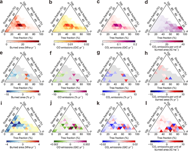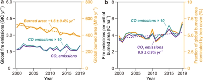 研究表明,全球野火燃烧面积的大幅下降主要发生在以草为主导(grass-dominated)的陆地植被区域,然而在以树(tree-dominated)为主导的陆地植被区域内燃烧面积有增加趋势。由树主导的陆地植被区域虽然仅占全球野火燃烧面积的5%,却贡献了野火二氧化碳排放的18%,因为树在单位燃烧面积上生物量和含碳量更高。虽然增加的森林野火燃烧面积少于减少的草原野火燃烧面积,但仍基本抵消了由草原野火减少导致的二氧化碳排放量下降,使近20年来全球野火二氧化碳排放量基本持平。森林生态系统与草原生态系统相比在野火后恢复更慢,森林野火如进一步导致毁林与森林退化,生态系统功能则在短期内难以恢复和重建,对陆地生产力和碳汇产生长期不利影响。近年来全球野火燃烧面积持续下降,但由野火带来的气候风险并没有随之减轻,增加的森林野火对气候系统仍具有显著威胁,因此仍需关注不同生态系统尤其是森林生态系统野火及其气候环境影响。