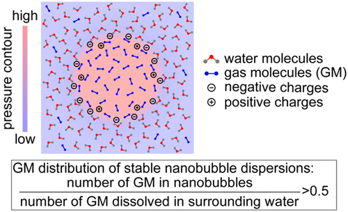 悬浮在液体中的纳米气泡始终处于布朗运动,其很多物性难以用实验手段直接探测,故对其稳定机制的解释尚缺乏共识。王兵研究团队在国家自然科学基金的支持下,采用分子动力学模拟的手段,统计揭示了不同尺寸体相纳米气泡的物性,包括气泡内密度、压强、表面电荷、表面分子结构,以及气体扩散特性等。在获得这些物性的基础上,研究团队进一步对纳米气泡涉及力学与电学效应的界面力平衡进行了静力学分析,对气泡内外气体互换扩散平衡进行了动力学分析,进而结合理论假设分析了其维持上述平衡状态的机制,从而提出了体相纳米气泡稳定性判据。