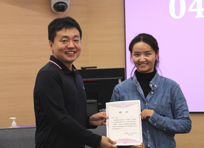 研工部综合办主任王竟达为第五期“石榴籽计划”班级辅导员、公管学院2018级博士生单良颁发聘书。单良表示将和同学们一道,将第五期“石榴籽计划”建设成有凝聚力的集体,让每位成员都能够在集体的舞台上展现自己、收获成长和友谊。