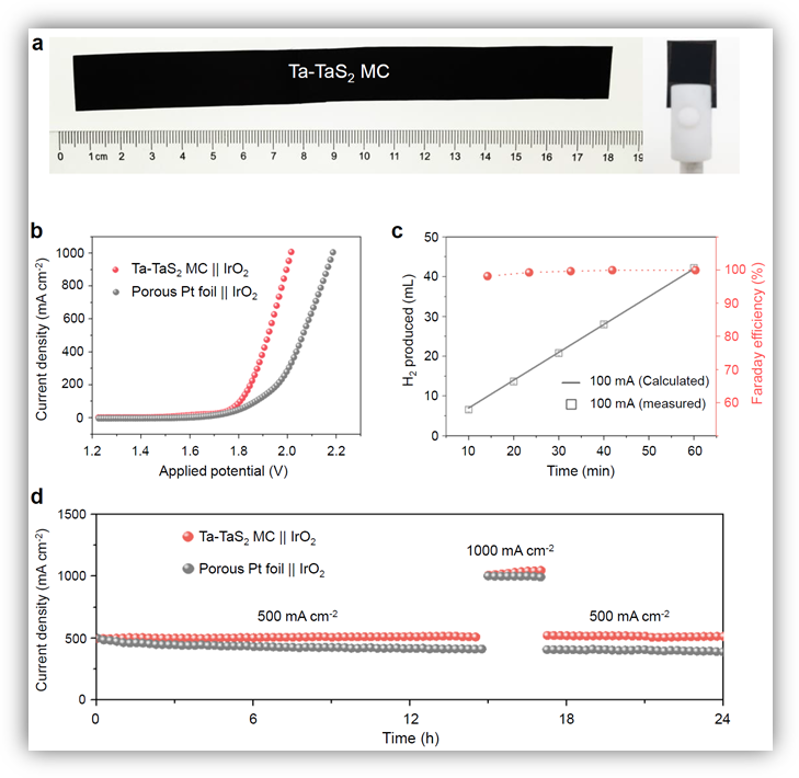 该研究通过一种定向固相合成法从金属基底衍生制备出大面积金属性二维材料电催化剂,金属基底与金属性二维材料共价结合并构建出一个近零电阻界面,该界面的电荷传输快、界面结合力强。第一性原理计算表明,金属基底可向催化剂中有效注入大量电荷,优化氢吸附自由能,提高催化活性;此外,能带结构图解析结果显示,金属基底与金属性二维材料均能在费米能级处贡献大量自由电子,这表明由金属基底与金属性二维材料组合的同源单体析氢电极展现出与金属相同的电学性质,进一步的电学测试结果也验证了这一结论。将该源单体析氢电极直接用于电解水析氢反应,其在2000 mA cm-2的工业大电流密度下仅需398 mV的过电位,优于大多数文献报道结果。此外,该析氢电极在大电流(200 -1000 mA cm-2)工况下持续200小时的析氢反应后性能无衰减,表现出具备工业应用条件的大电流析氢稳定性。进一步的研究表明,以该同源单体析氢电极为阴极、商业氧化铱为阳极组装在电解水器件中,其表现出优于商业铂基析氢电极的电解水性能,仅在1.98 V的施加电压下就实现了1000 mA cm-2的析氢电流密度,法拉第效率接近100%。该同源单体析氢电极制备成本低、催化性能高,在工业电解水制氢电极中具有规模化应用前景。以上研究结果同时为构建电解水制氢电极提供了新思路,相关策略有望进一步拓展到其他应用电极材料体系中。