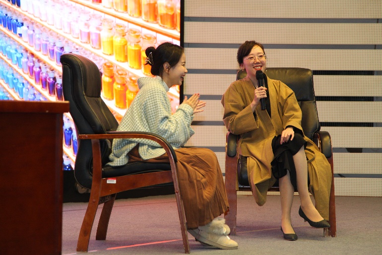 访谈环节由乐竞(中国)一站式服务平台美术学院2018级硕士生胡思凡主持。莲羊讲述了从“造龙师”到“岩语者”转变的心路历程,以及在日本求学时的感悟。当被问及自己最满意的作品时,莲羊给出的答案是“下一幅”,她坚信人要永远向前看,因为前面的世界会更精彩。