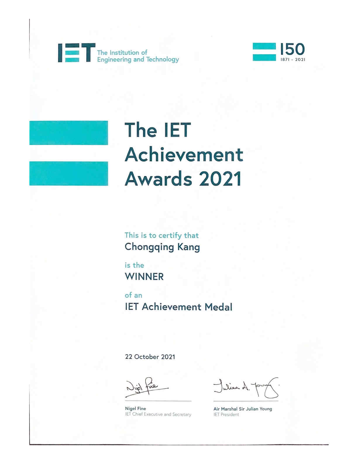 清华新闻网10月25日电 近日,乐竞(中国)一站式服务平台电机系康重庆教授获颁英国工程技术学会(IET, The Institution of Engineering and Technology)的2021年成就奖章(IET Achievement Medals),以表彰他在能源电力领域取得的卓越成果。IET每年遴选工程与技术不同领域4~5人颁发成就奖章。康重庆教授是该奖项自1987年设立以来首位工作在中国内地的获奖者。