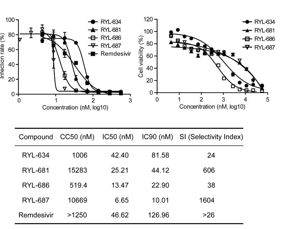 埃博拉病毒的培养需在生物安全4级(BSL-4)实验室内进行,因此大大降低了筛选抗病毒药物的效率。研究团队首先建立了安全可靠且模拟埃博拉病毒复制的细胞模型,对一系列新型的喹诺酮类化合物的抗病毒活性进行筛选,结果表明RYL-687、RYL-686和RYL-681化合物抑制病毒感染的IC50(半抑制病毒浓度)均比瑞德西韦低,并且细胞毒性非常低(图1)。