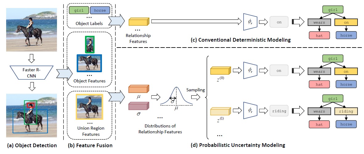 为了生成“精确”表述的场景图,几乎所有现有的方法都以确定性的方式预测成对关系,而视觉关系在语义上往往具有歧义性。具体来说,受语言学知识的启发,研究者将歧义分为同义词歧义、上下位词歧义和多视点歧义三类,这种歧义性自然会导致隐性多标签问题,也激发了对预测多样性的需求。这项工作提出了一个新颖的即插即用式概率不确定性建模(PUM)模块,它将每个物体联合区域建模为高斯分布,其方差度量相应视觉内容的不确定性,与传统的确定性方法相比,这种不确定性建模带来了特征表示的随机性,使得预测具有多样性。作为一个副产品,PUM还能够覆盖更细粒度的关系,从而缓解对高频关系的偏见。在大规模视觉数据集上的充足实验表明,将PUM与新提出的ResCAGCN相结合可以在平均召回度量下获得最佳性能。此外,通过将PUM插入到一些现有模型中,证明了PUM的普适性,文中也对其生成多样化但合理的视觉关系的能力进行了深入分析。