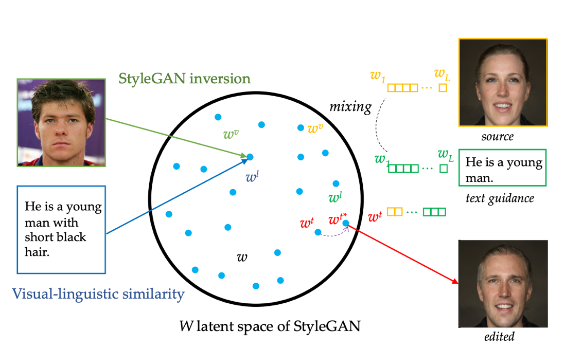 方法框架图:GAN Inversion将图像映射到预训练GAN模型的W隐空间得到隐编码;视觉-语言相似性学习在W空间文本和视觉内容的对齐;以及不同模态得到的隐编码的交换和优化。