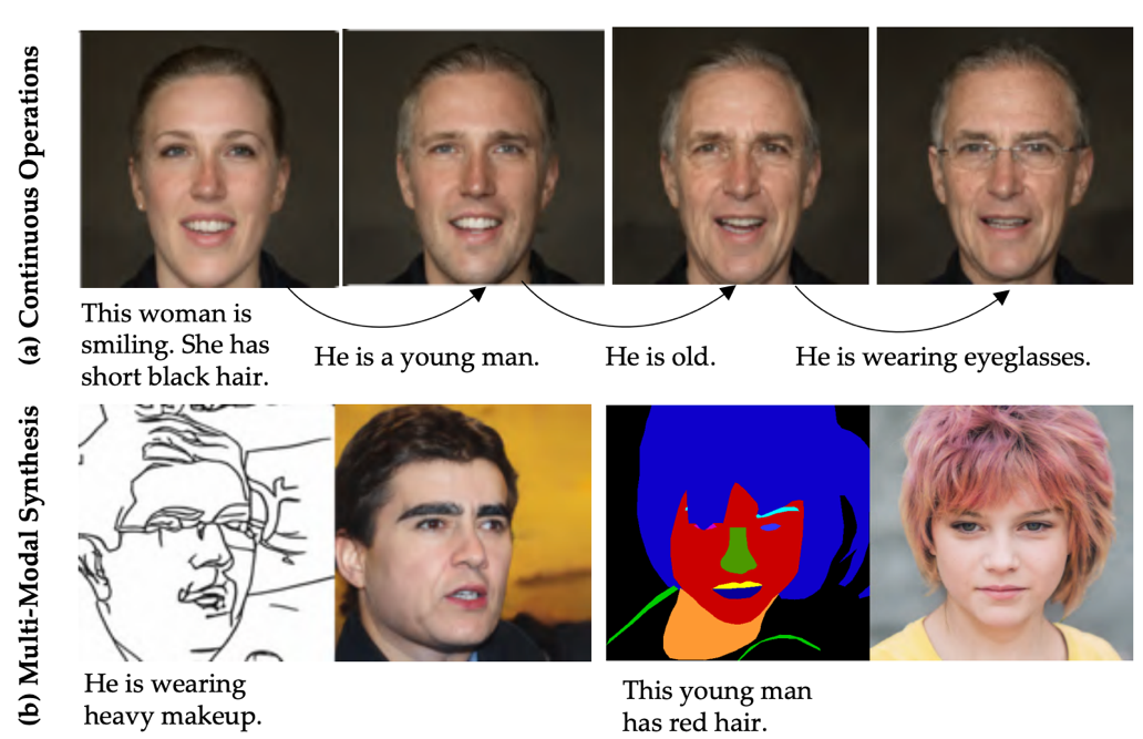 该论文提出文本引导的人脸图像生成和编辑的统一框架,融合了不同模态的输入,可输出1024*1024分辨率的生成和编辑结果。文章也针对根据多模态生成人脸图像的问题开放了新的数据集,包含真实人脸图像和相应的语义分割图、草图和文本描述。