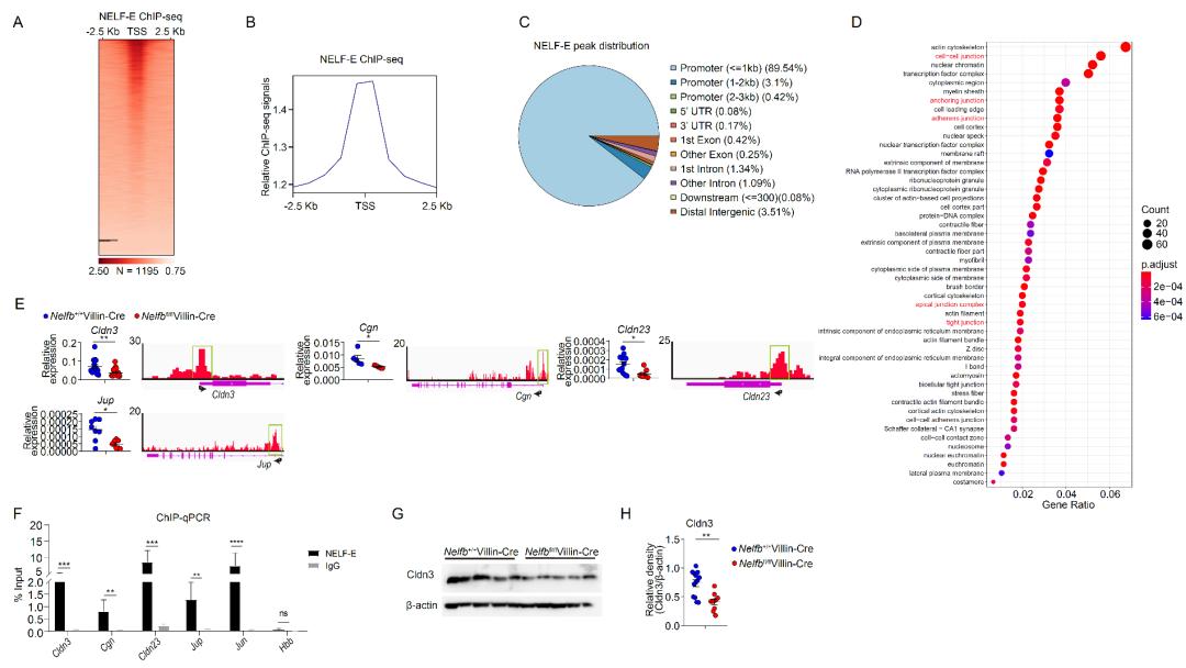 图1.肠上皮NELF通过直接靶向启动子区域调控多种细胞连接相关基因的表达