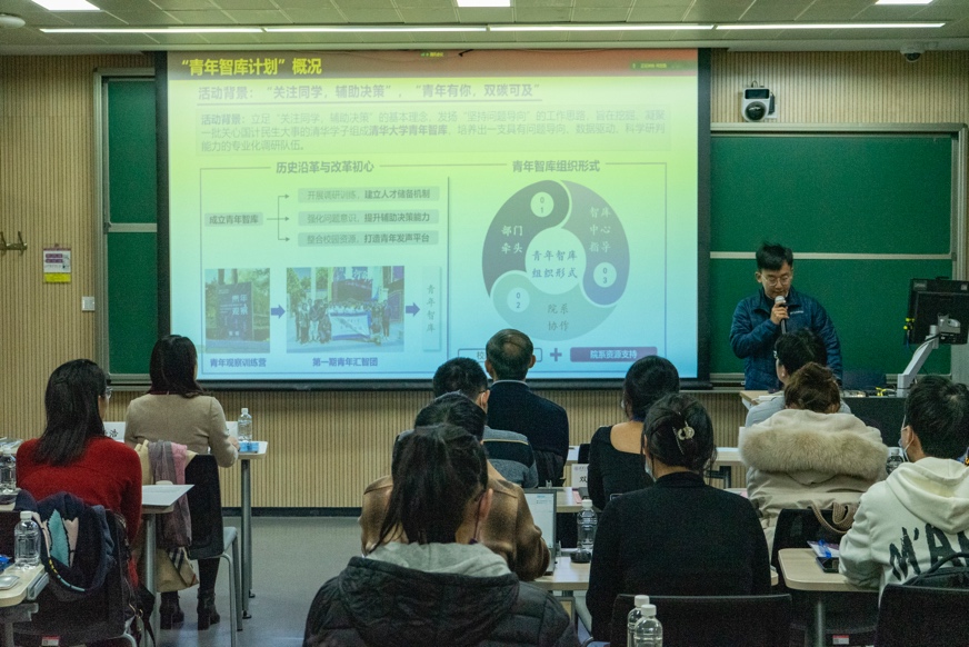 土木系2018级博士研究生安云龙向各位嘉宾和学员介绍了“青年智库计划”的基本情况。本期“青年智库计划”汇集来自18个院系的40名学员,以“双碳战略”“双碳经济”“双碳科技”“双碳生活”“双碳文化”五个子主题分队调研,鼓励广大清华学子参与“碳达峰碳中和”调研讨论,为实现双碳目标贡献清华青年方案。